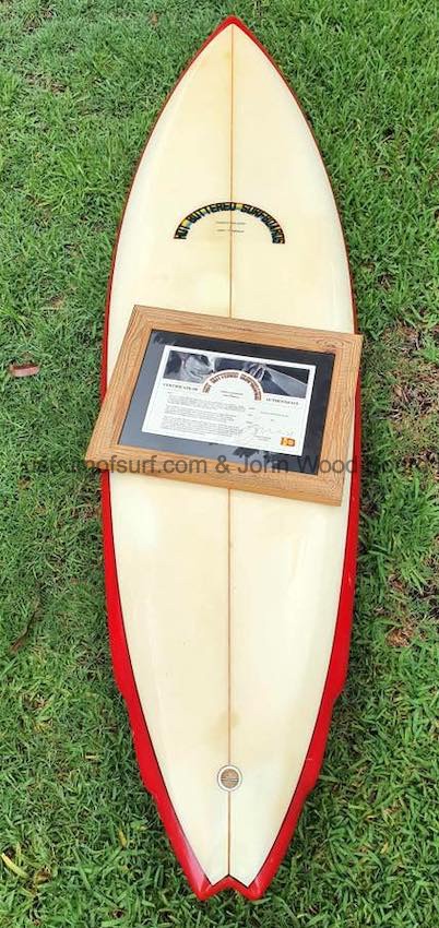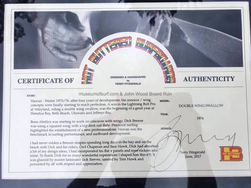 This by far the best collectable board I have seen from the 70's. As you can by the certificate of authenticity this board was made by Terry Fitzgerald, for the master Dick Brewer. A blend of Australia's sultan of speed and a legend of Hawaiian board builders.