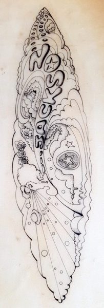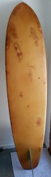 Jackson Surfboards was Cronulla shire’s premiere board builder for many over 50 years, this is a very early example as the decal is a hand-drawn on a tissue. Brian Jackson or “Jacko” as everyone knew him was larger than life character and was an extremely popular guy. From memory, I think the label started out as Jackson & Cansdell or something similar, but Jacko went out on his own and this board is one of the first of them.