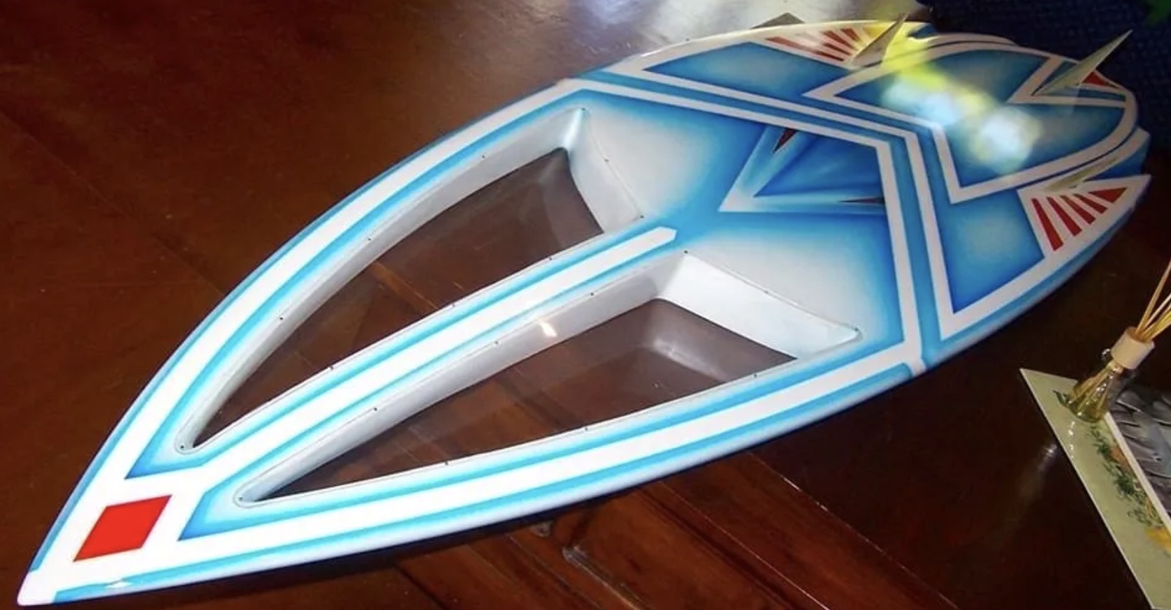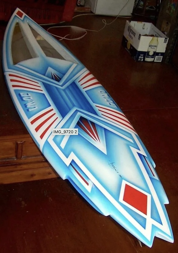STEVE BARBER had the board for a good few years, that wasn’t a problem, really, I was having a marriage split and raising my kids, busy, busy … I crossed steve’s path later in the ’90s or even early 2000s, we agreed it was time to do somethin’, steve nutted out the rebates and perspex using all the skills a surfboard builder can muster, plus a bit … but he had to sand the paint job ….