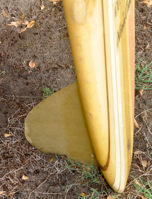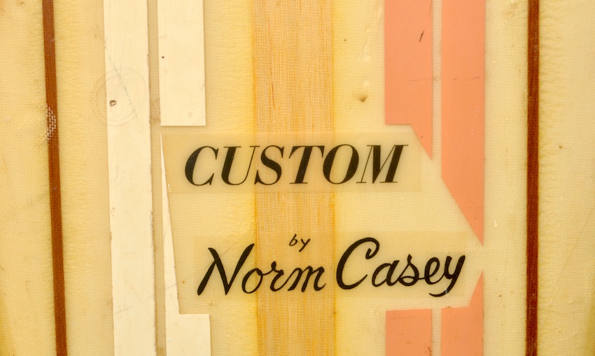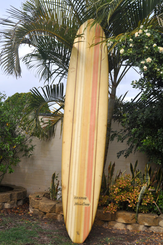 During the early years of surfboard manufacturing, the Norm Casey label was as big as the Brookvale six, Norm’s boards could be found in most retail outlets of the day, which was totally different from today as you went to a Hardware store, A major retail chain such as Walton’s, (Today’s equivalent would be David Jones) or you went to the factory and ordered a custom board such as this one. Peter has had this board from new and is a great example of Norm’s quality with a solid balsa stringer through the center and two smaller redwood stringers on either side. This made these boards virtually unbreakable, but at the same time a lot heavier. Unfortunately, no leg ropes made it imperative your board could hit the rocks or Manly wall without being obliterated. Thanks for sharing Peter.