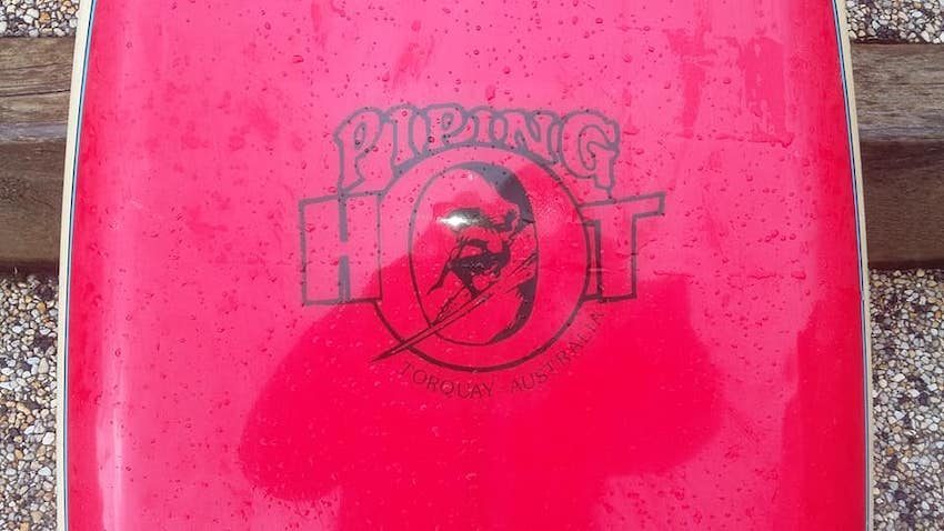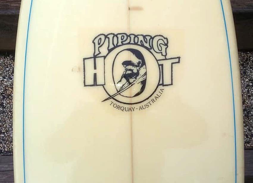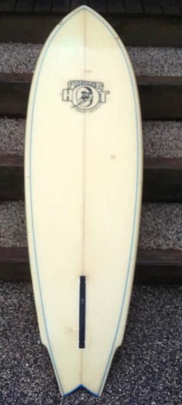 Michael Patterson shaped 6′ x 19.75″ single fin in excellent condition. Double black blue pin lines on deck with Grant Forbes designed Piping Hot logo.