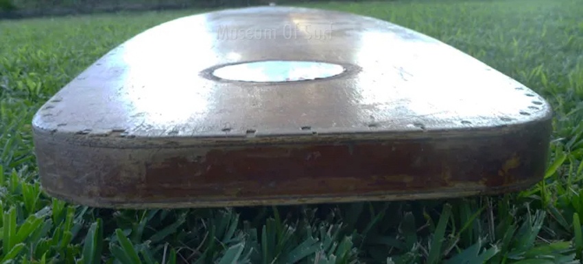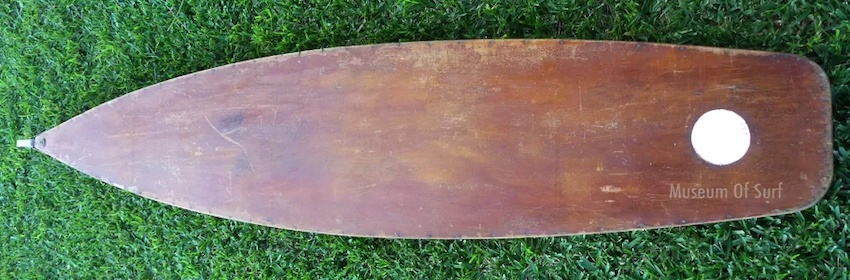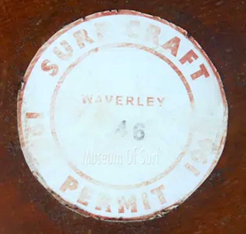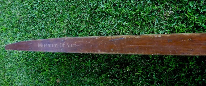This board is part of the Sunset collection. Approximately 10 foot long and is a great example of the toothpick era. Plywood construction. These boards were hollow timber framed with a plywood shell. This one was still used through the 60’s, as you can see the registration sticker for Waverley Council.