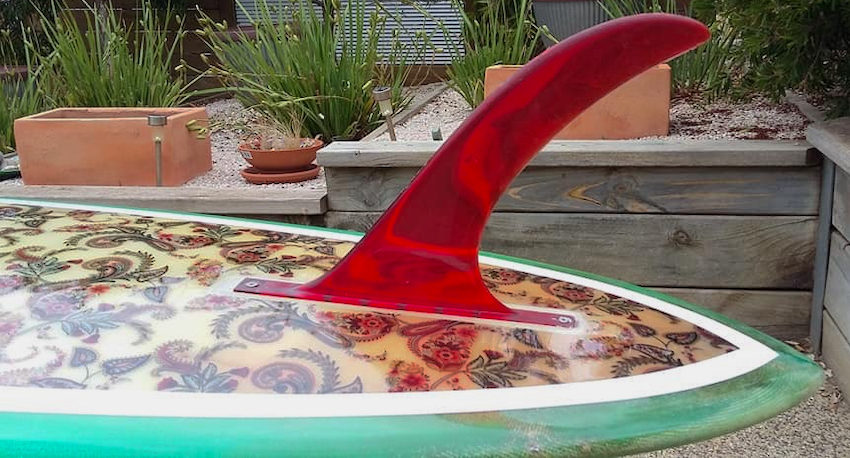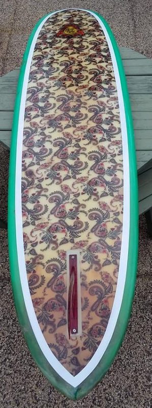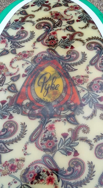 Pyke surfboards from Victoria were great boards and attracted a huge following. This board shows the paisley fabric under the glass.
