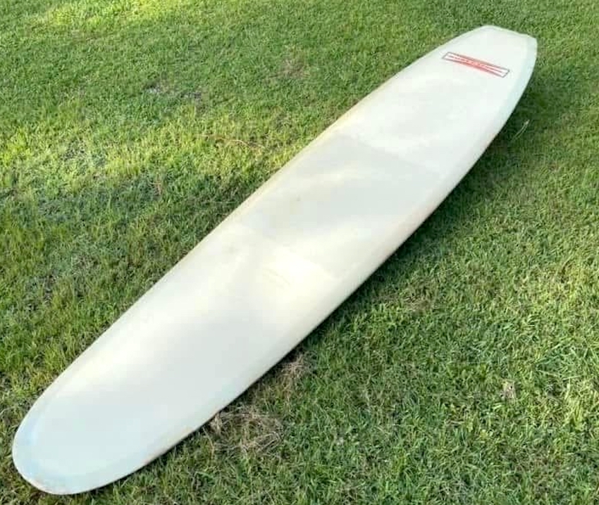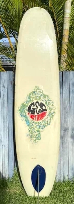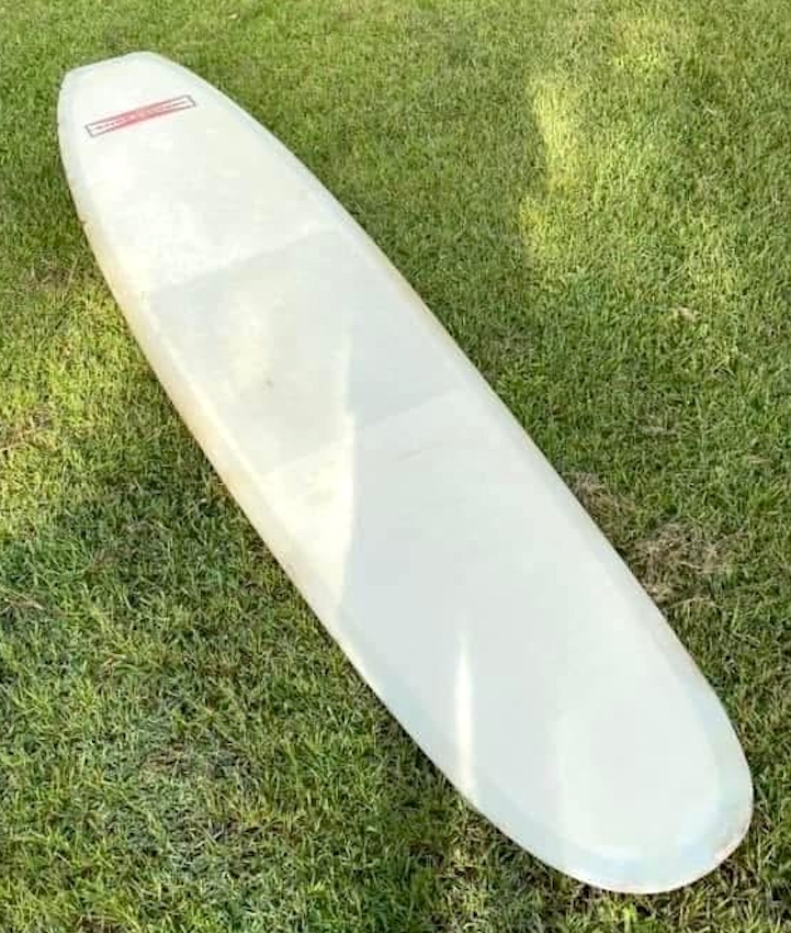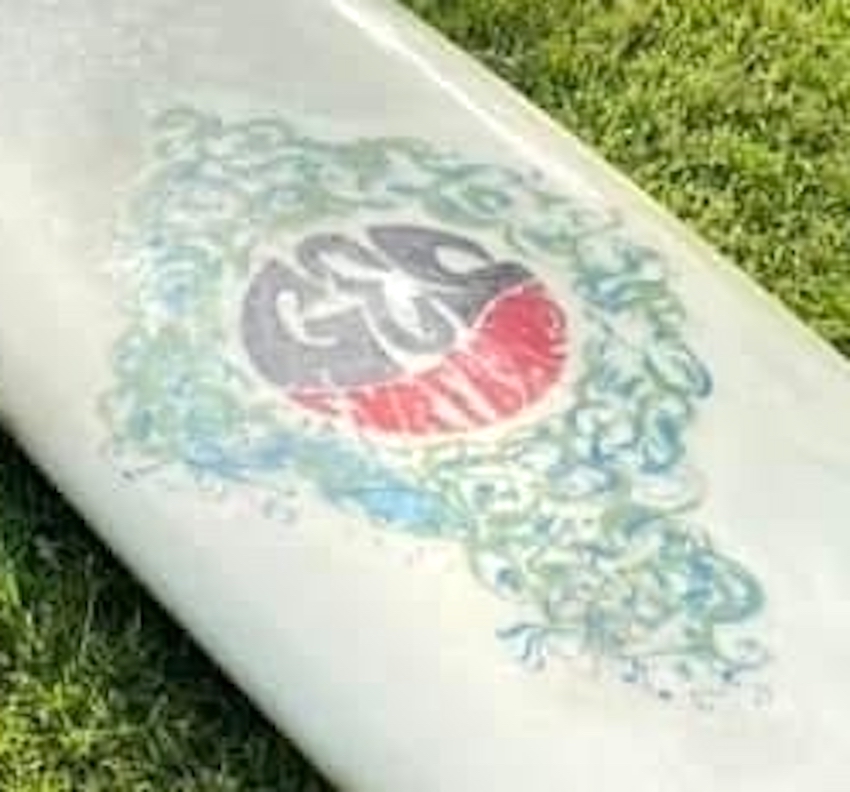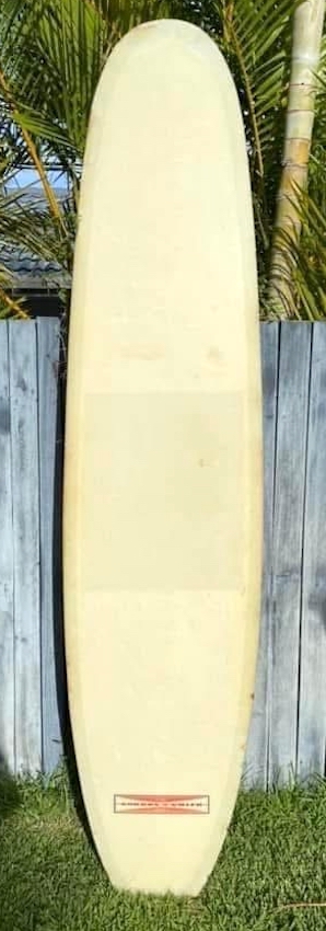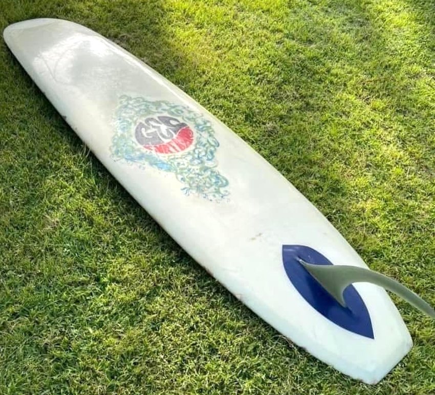 This board is a part of a collection & is a great example of the era of peace & love with the psychedelic logos. The heavy V Bottom and wide tail made them very loose compared to the old style log, but many found them difficult to ride until you got used to the rail-to-rail turning ability.
